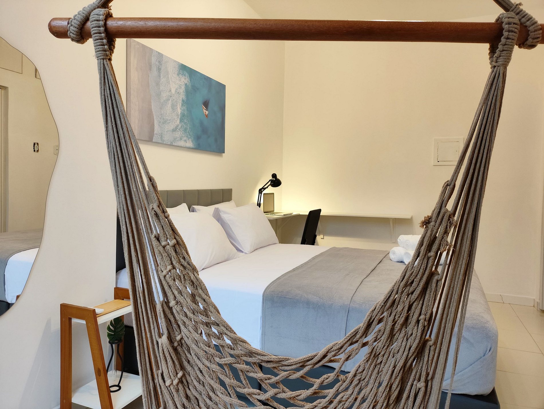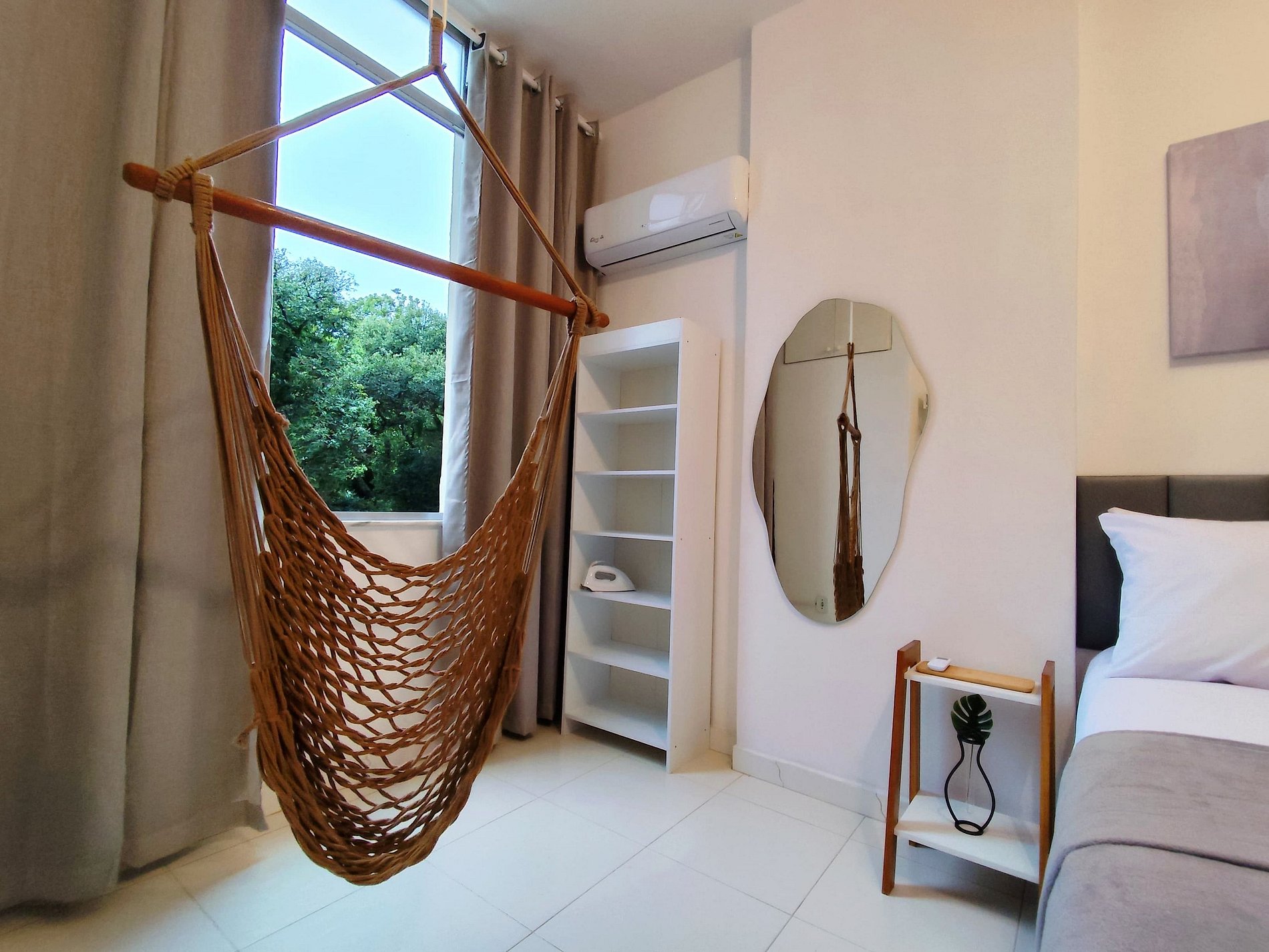 Suíte :• Ar-condicionado split silencioso + ventilador com controle remoto • Cama queen com pillow top e enxoval premium • Cortinas blackout para noites mais tranquilas • TV no quarto, escrivaninha, iluminação aconchegante e cadeira suspensa para relaxar ou ler com conforto, ferro de passar