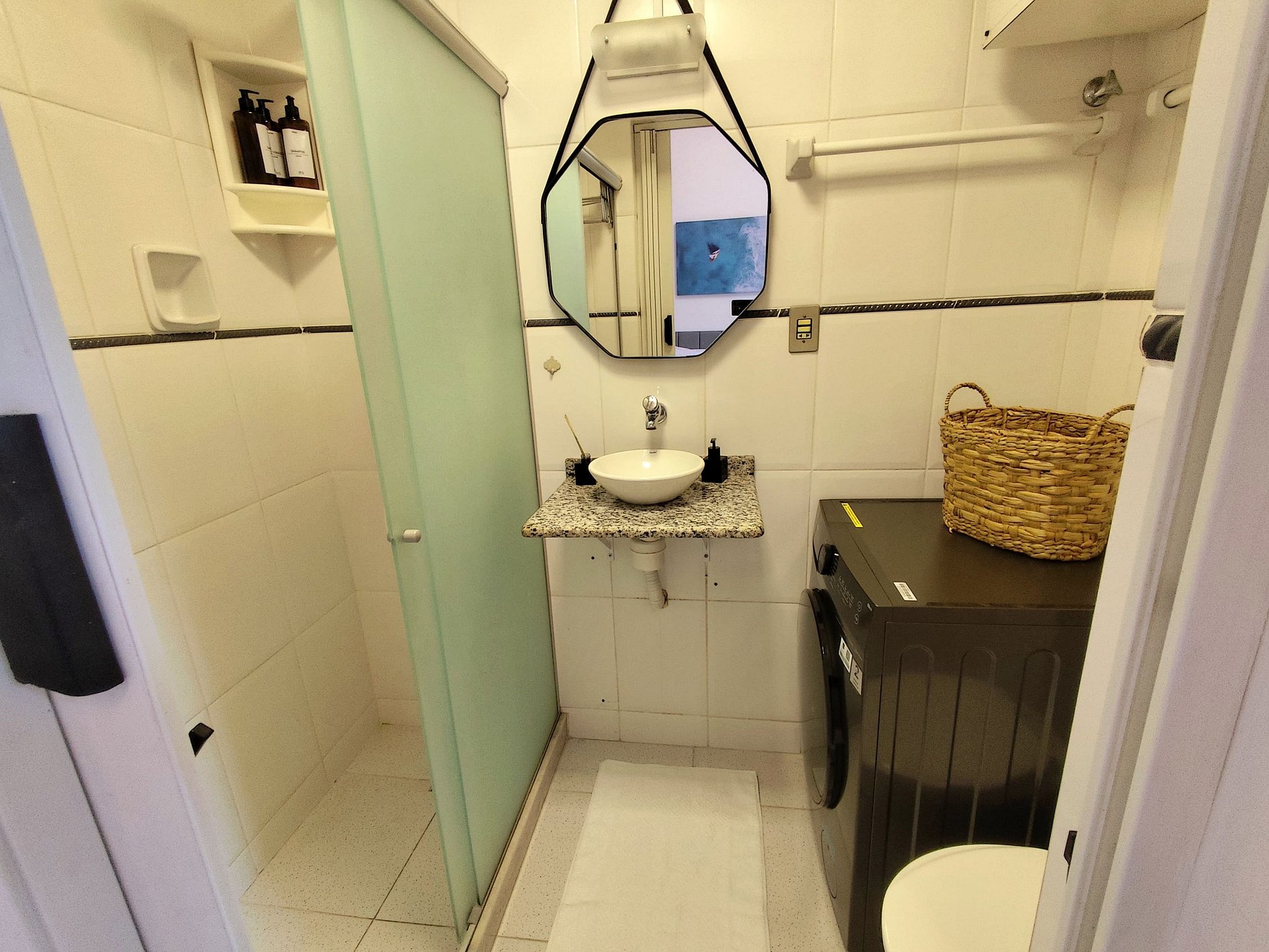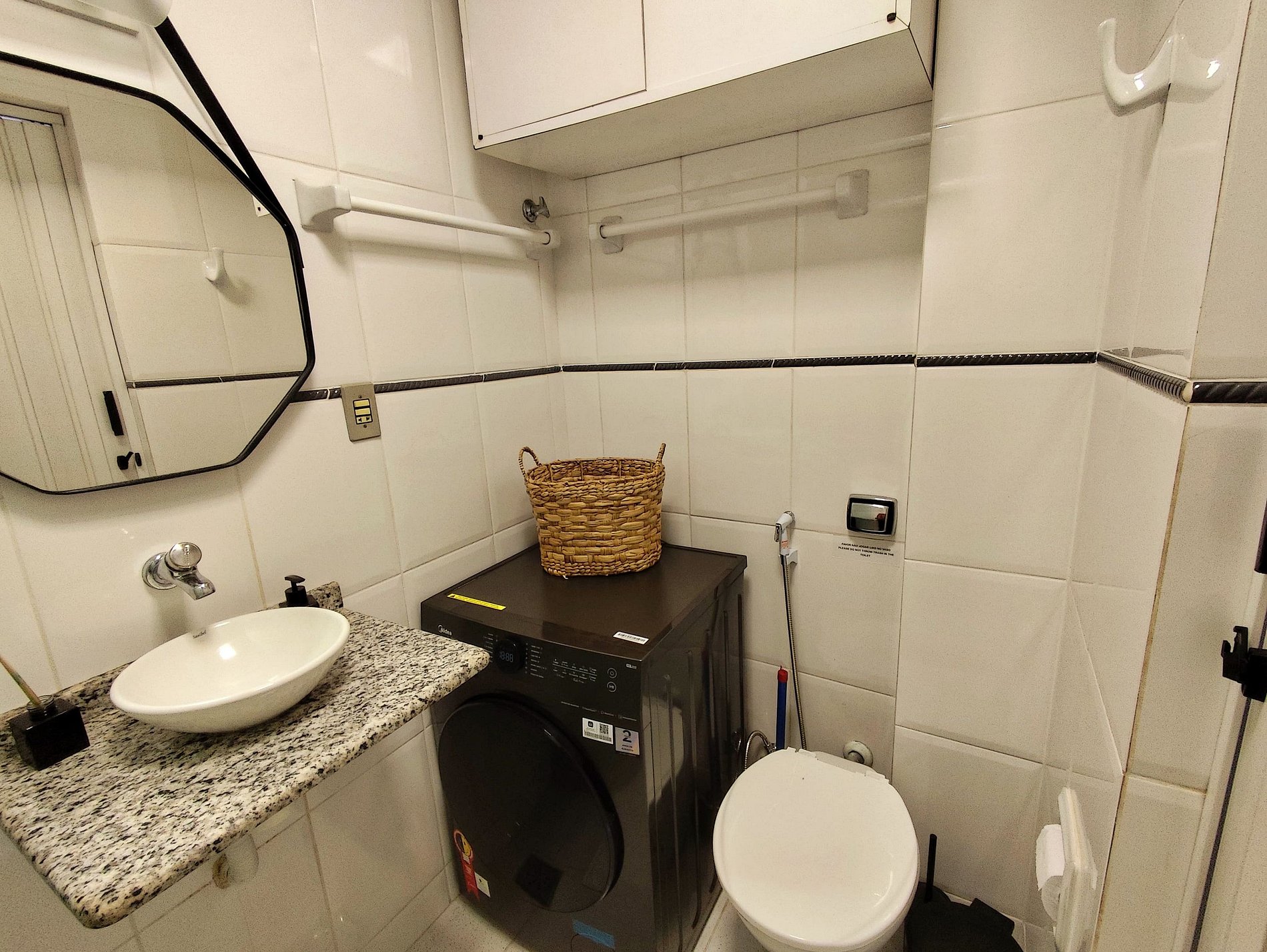 Banheiro: • lavadora e secadora integradas, secador de cabelo e amenities de banho