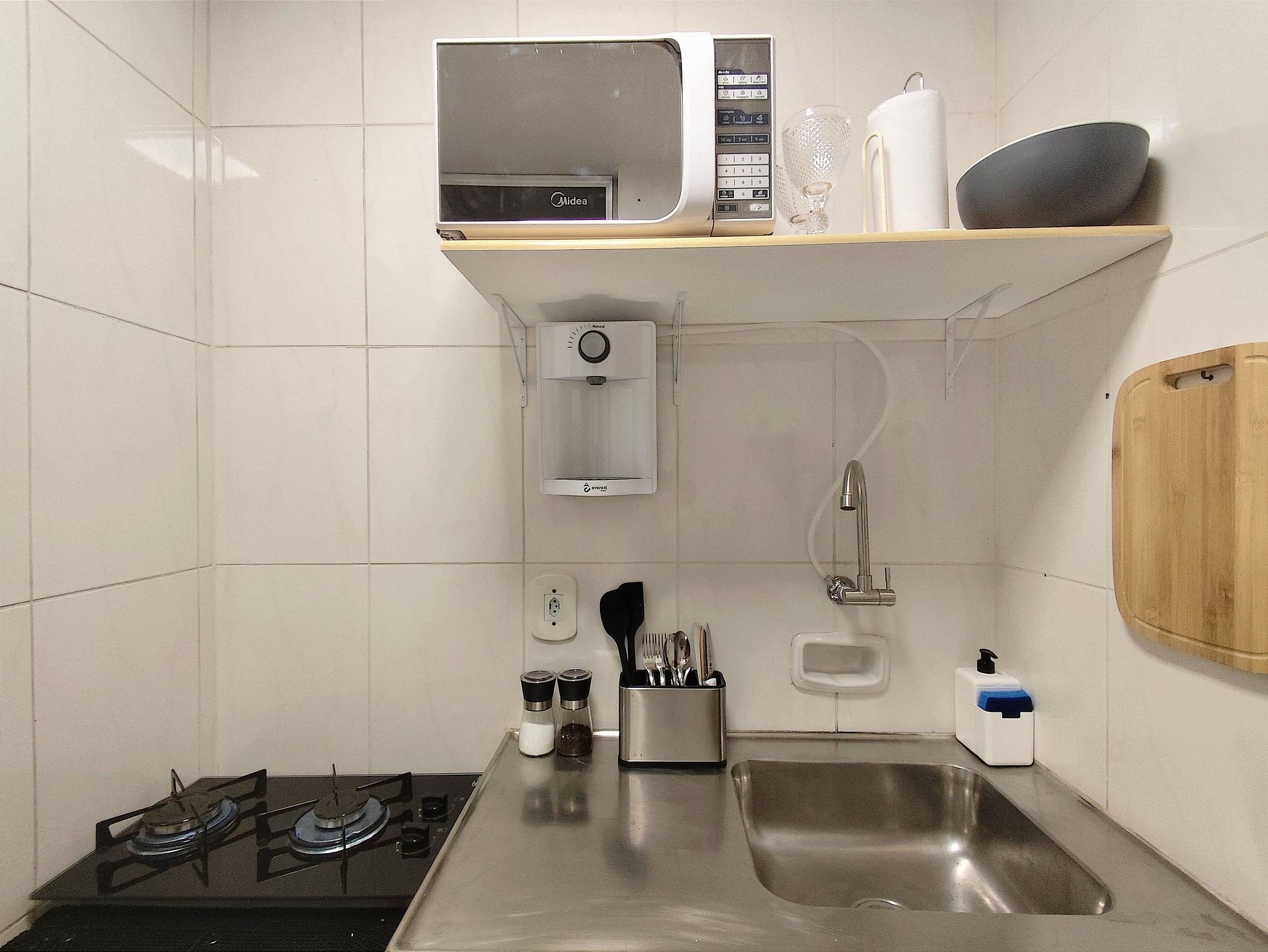 Área social: • Sala com TV 60” e sofá espaçoso e confortável • Internet de alta velocidade e área de trabalho funcional • Cozinha completa com eletrodomésticos modernos: Nespresso, airfryer, utensílios de qualidade, purificador de água • Lavadora e secadora integradas
